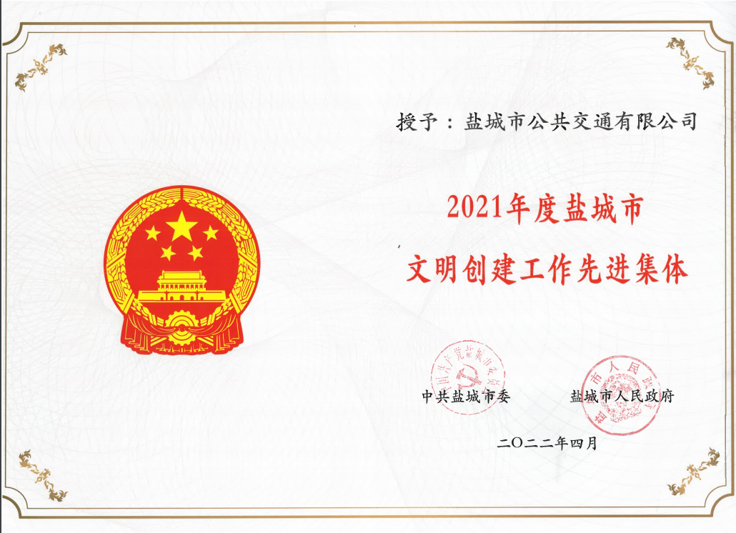 - 2022年4月公司被授予2021年度鹽城市文明創(chuàng)建工作先進集體榮譽稱號